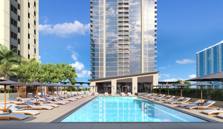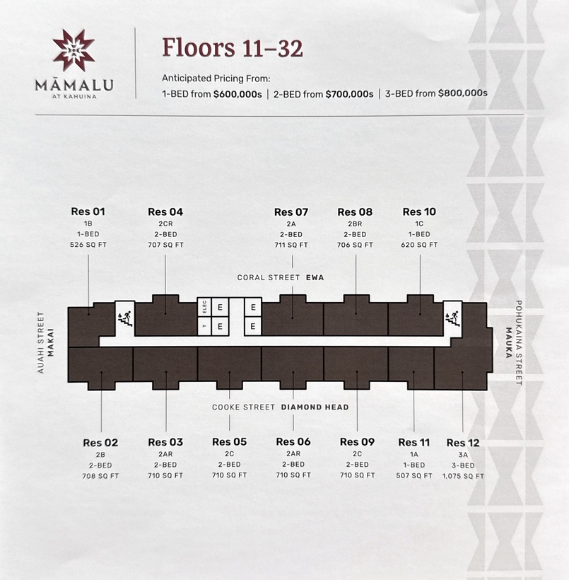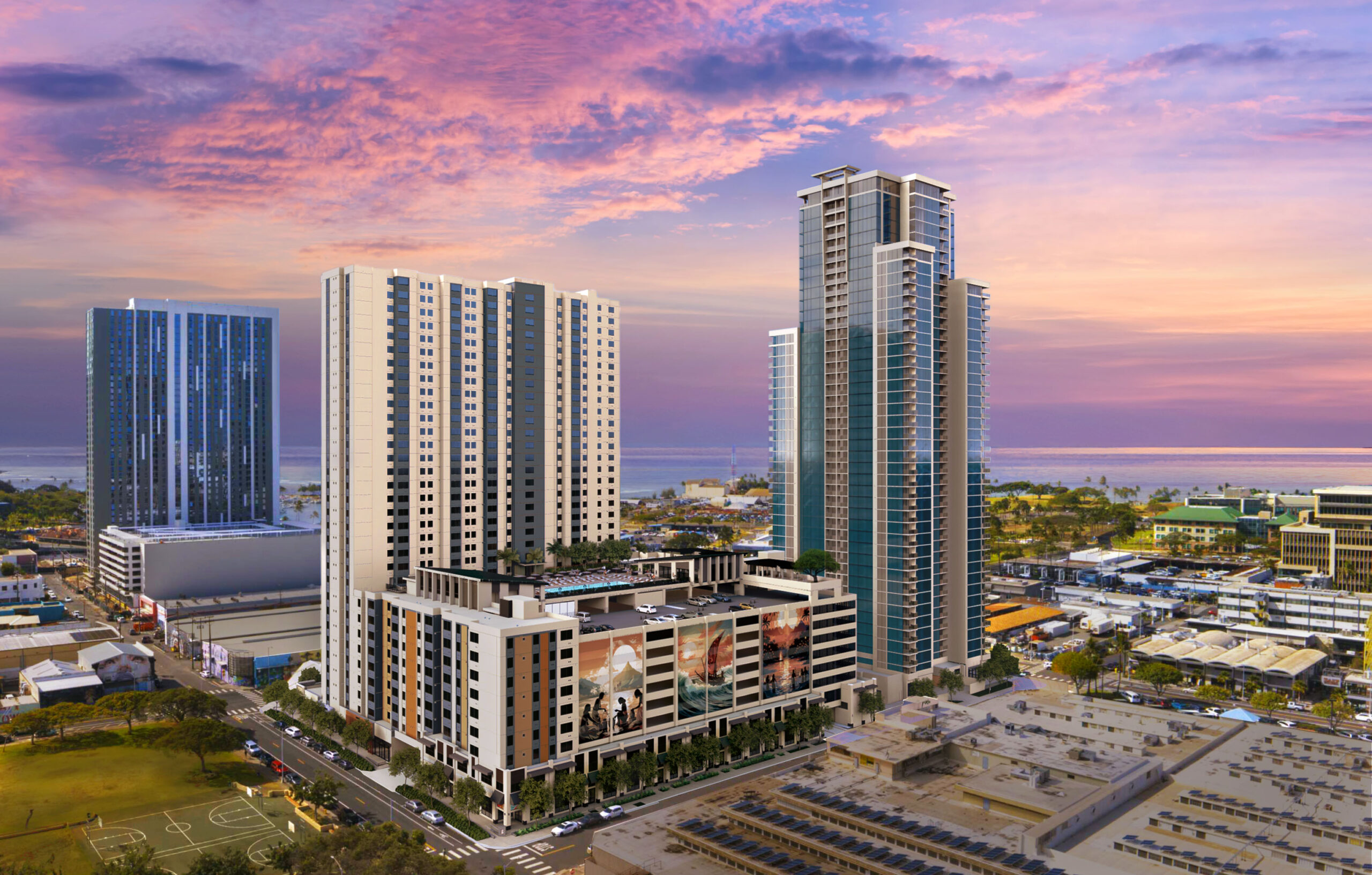 カフイナは合計737戸の住居ユニットを含む2棟のタワー、「ラマク / Lamaku」と「ママル / Mamalu」で構成され、うち396戸はHHFD住宅*(アフォーダブル・ハウジング)として提供されます。「ラマク / Lamaku」は43階建てのタワーで、120戸のHHFD住宅と329戸の市場向けユニットが販売されます。また、「ママル / Mamalu」は32階建てのもう一つのタワーの名称で、276戸のHHFD住宅と、1階に12戸の住戸兼仕事場のロフトユニットが販売されます。同じ1階の35,000平方フィートが商業および小売スペース、1000台以上を収容する9階建ての駐車場、その屋上がアメニティエリアとなり、プール、スパ、フィットネスセンター、BBQエリア、プレイグラウンドなどが設けられる予定です。