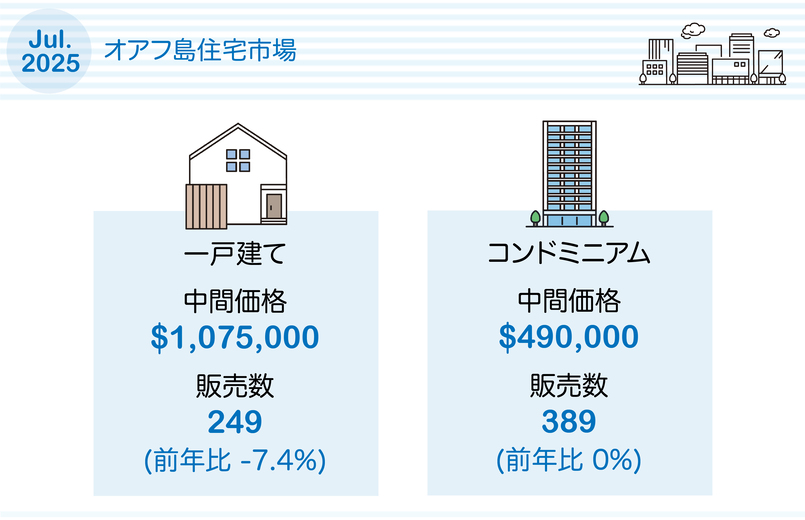 オアフ島の住宅市場は7月に若干の調整が見られ、一戸建て住宅の販売戸数は前年比7.4%減少しましたが、コンドミニアムの販売戸数は横ばいでした。一戸建て住宅の販売戸数は前年の269戸から249戸に減少し、コンドミニアムの販売戸数は389戸で横ばいでした。年初来の販売戸数は、一戸建て住宅では2024年の水準を2.9%下回り、コンドミニアムでは5.1%下回っています。